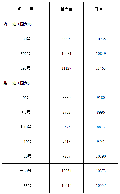 黑龙江省成品油最高零售价格表