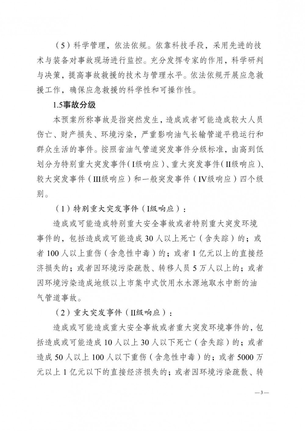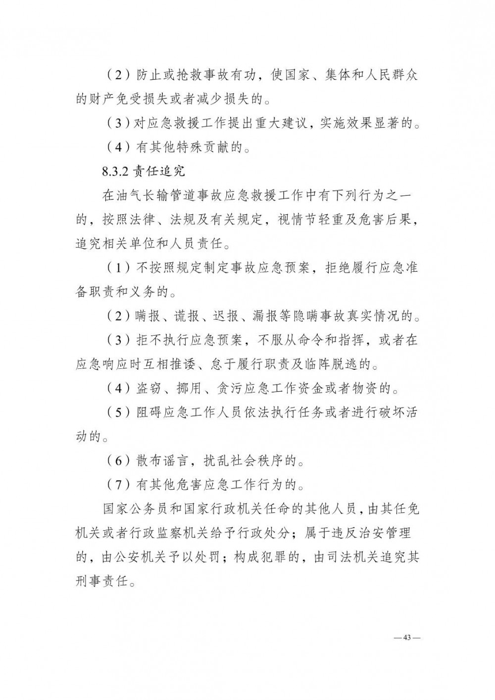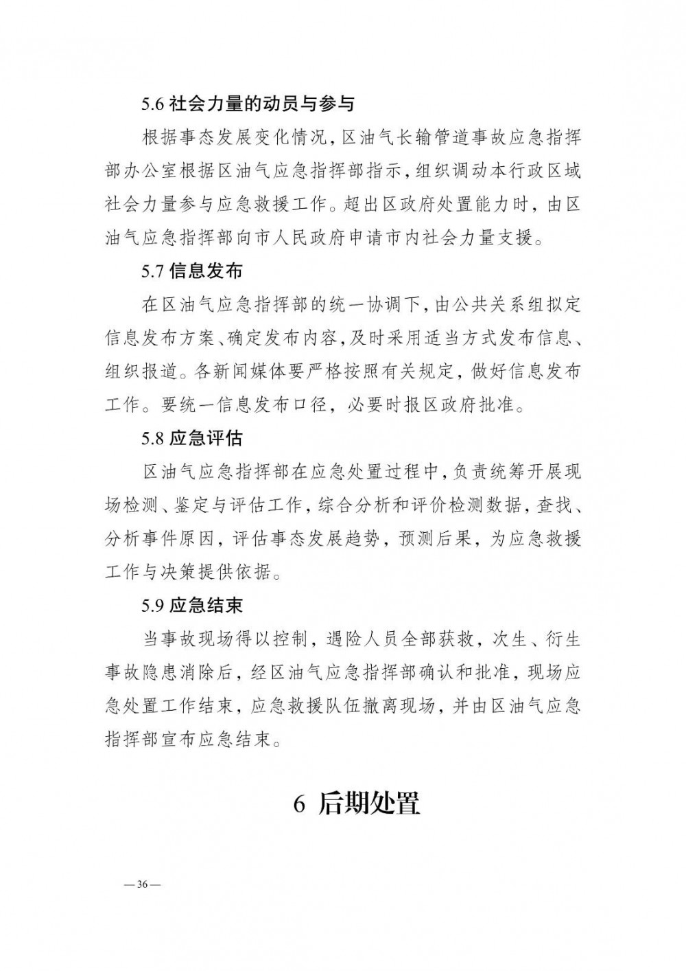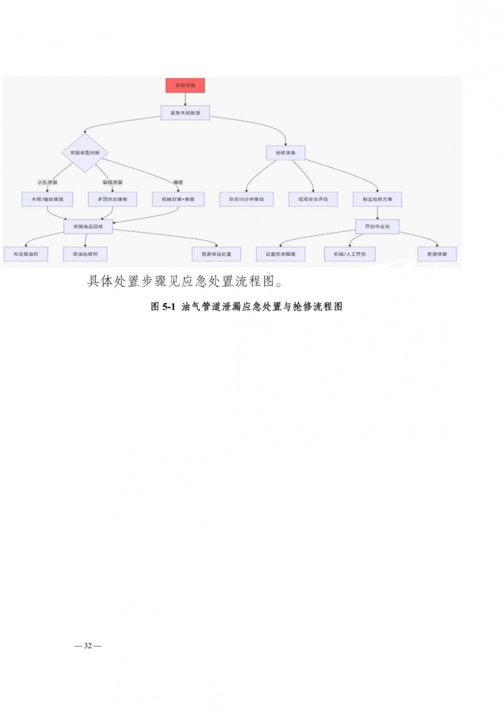 (五)应急处置。对于油气长输管发生事故后的应急响应、指挥与协调、先期处置、现场处置、安全防护、社会力量的动员与参与、信息发布、应急评估、应急结束等不同阶段应急处置程序、步骤与要求进行了详细说明。