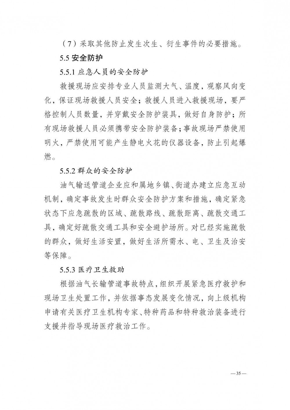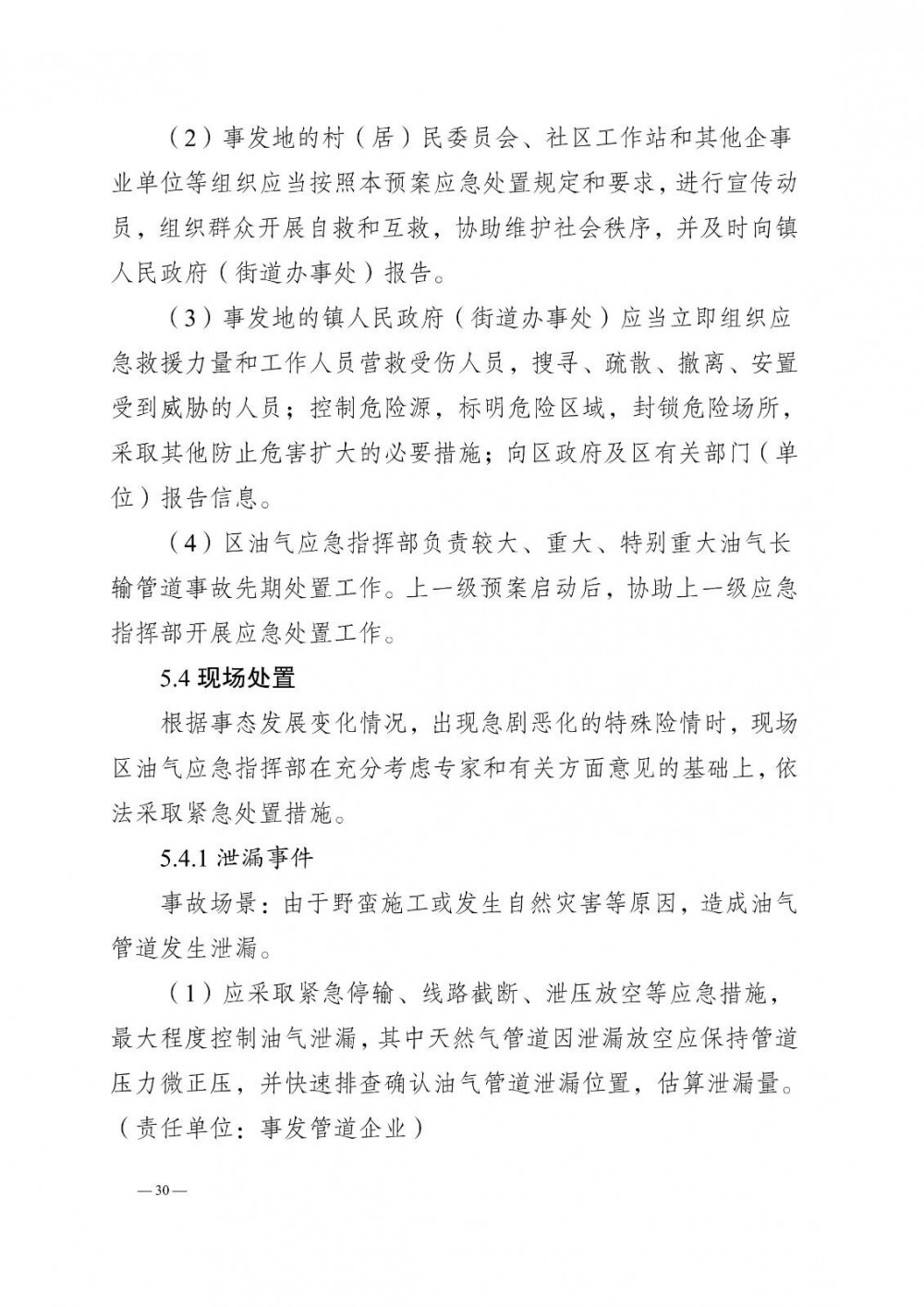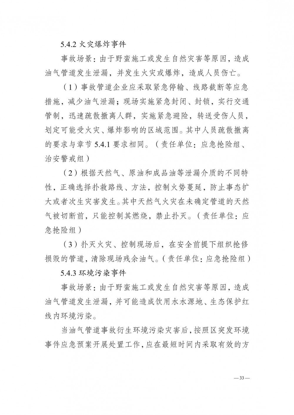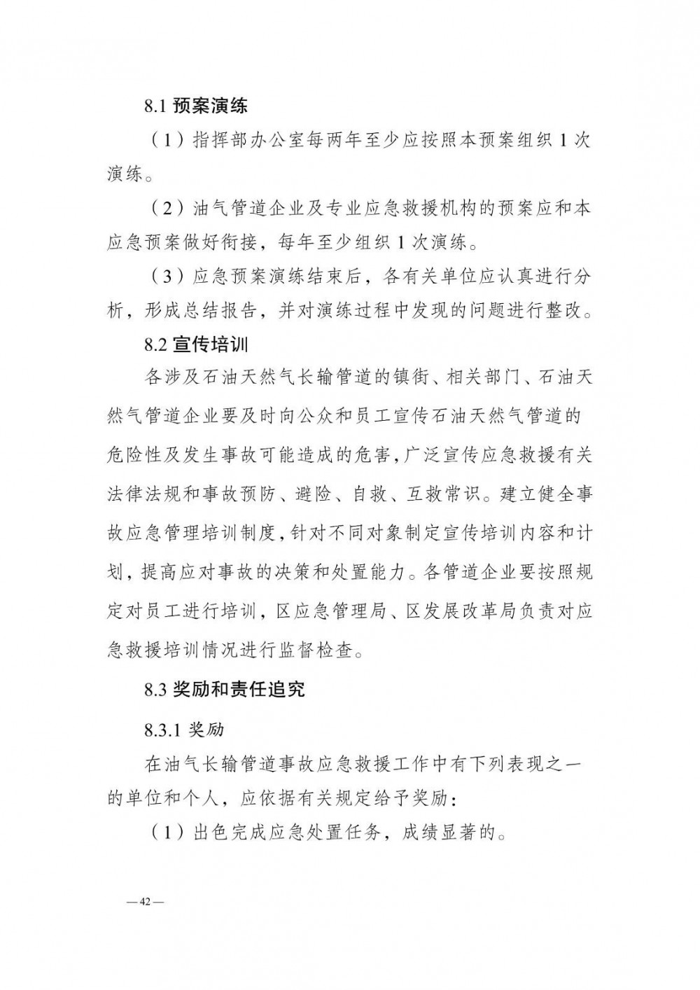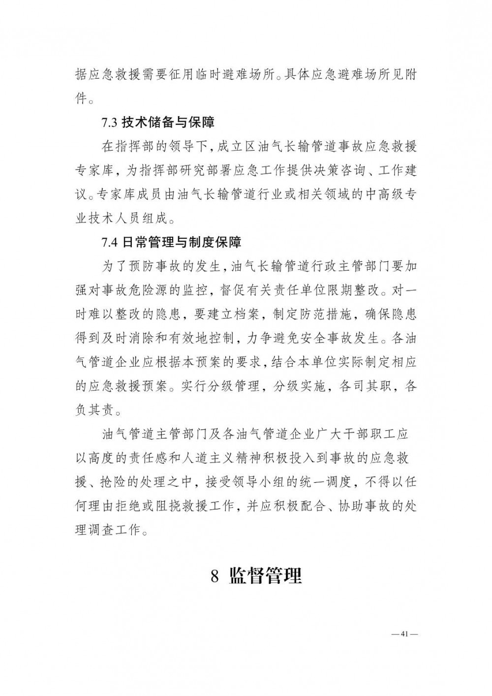 (五)应急处置。对于油气长输管发生事故后的应急响应、指挥与协调、先期处置、现场处置、安全防护、社会力量的动员与参与、信息发布、应急评估、应急结束等不同阶段应急处置程序、步骤与要求进行了详细说明。