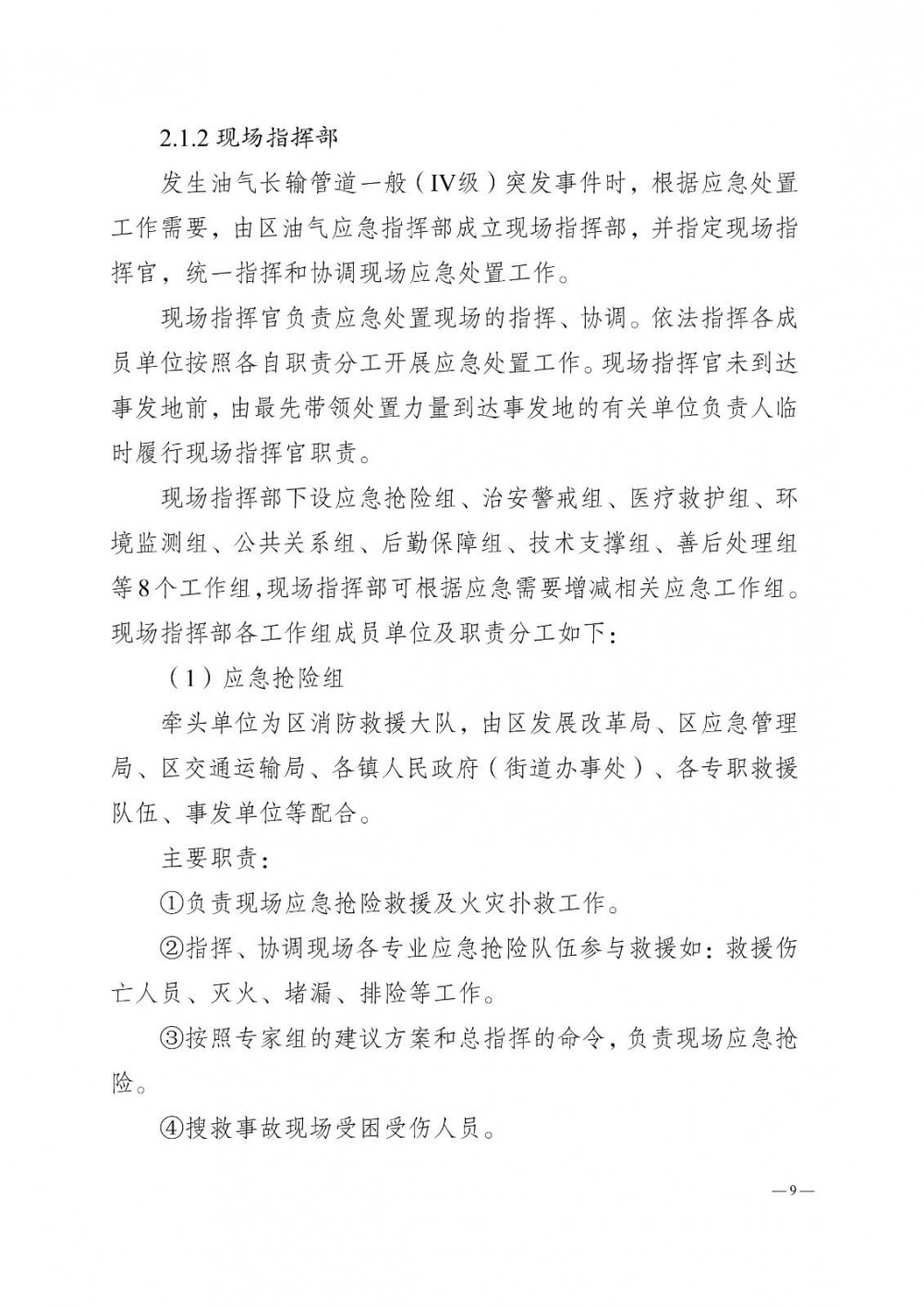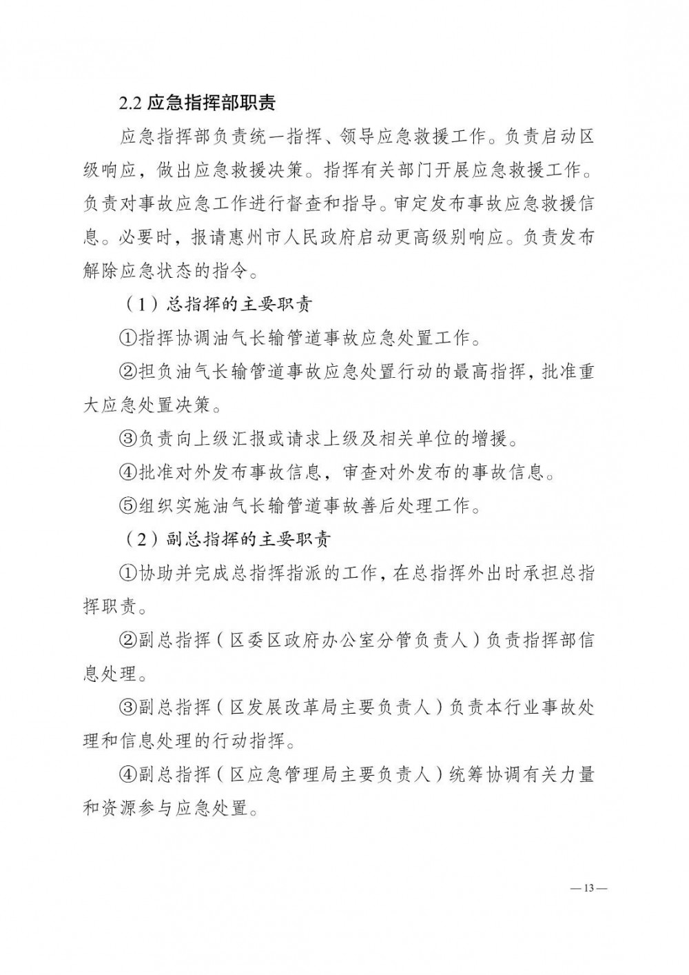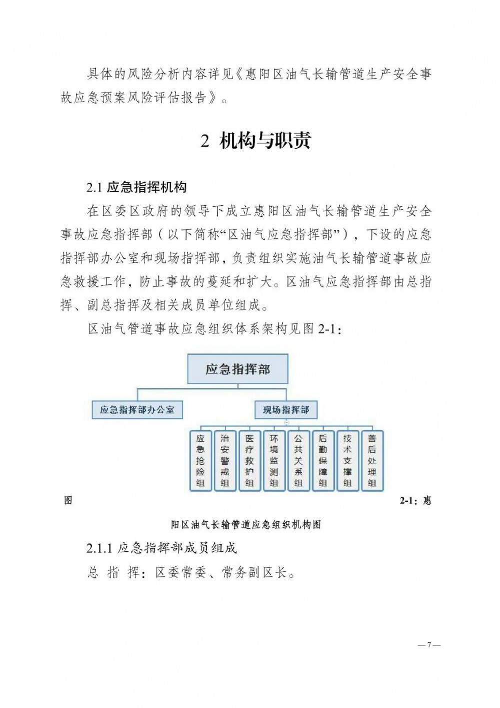 (二)机构与职责。对惠阳区油气长输管道生产安全事故应急指挥部及各个成员的构成及职责进行明确,包括现场指挥部下设的应急抢险组、治安警戒组、医疗救护组、环境监测组、公共关系组、后勤保障组、技术支撑组、善后处理组等8个工作组的职责进行了详细描述。