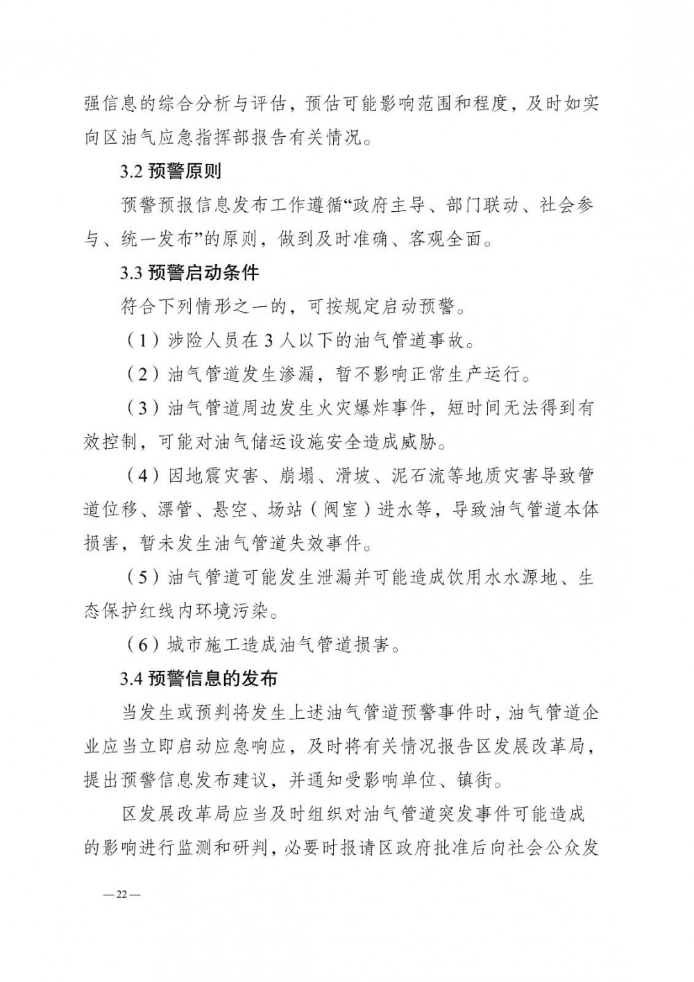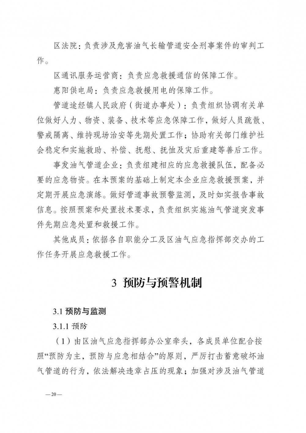 (三)预防与预警机制。对惠阳区油气长输管道突发事件的预防与监测、预警启动条件、预警信息的发布、预警行动、预警调整和解除等各项机制与程序进行详细的说明。